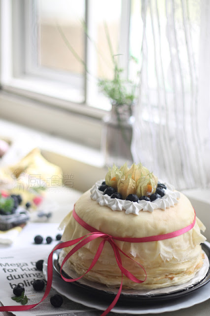 8. 倒入已经凝固的鲜奶油奶冻层上, 放入冰箱里冷藏大约1小时, 摆上切块芒果肉, 蓝莓以及百香果汁, 即可享用。
